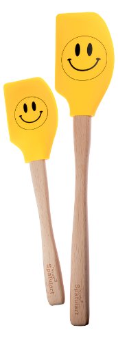 These Tovolo spatulas feature an all-season design with a cheery smiley face printed on each silicone head that is heat resistant to 600 degrees F. The working heads are curved on one side and flat on the other, to fit all your bowls and pans. The smooth surface effortless glides and spreads batter or frosting. This set has two sizes; 12-1/2 inches long, and the other is 9 inches long, for a variety of jobs in the kitchen.